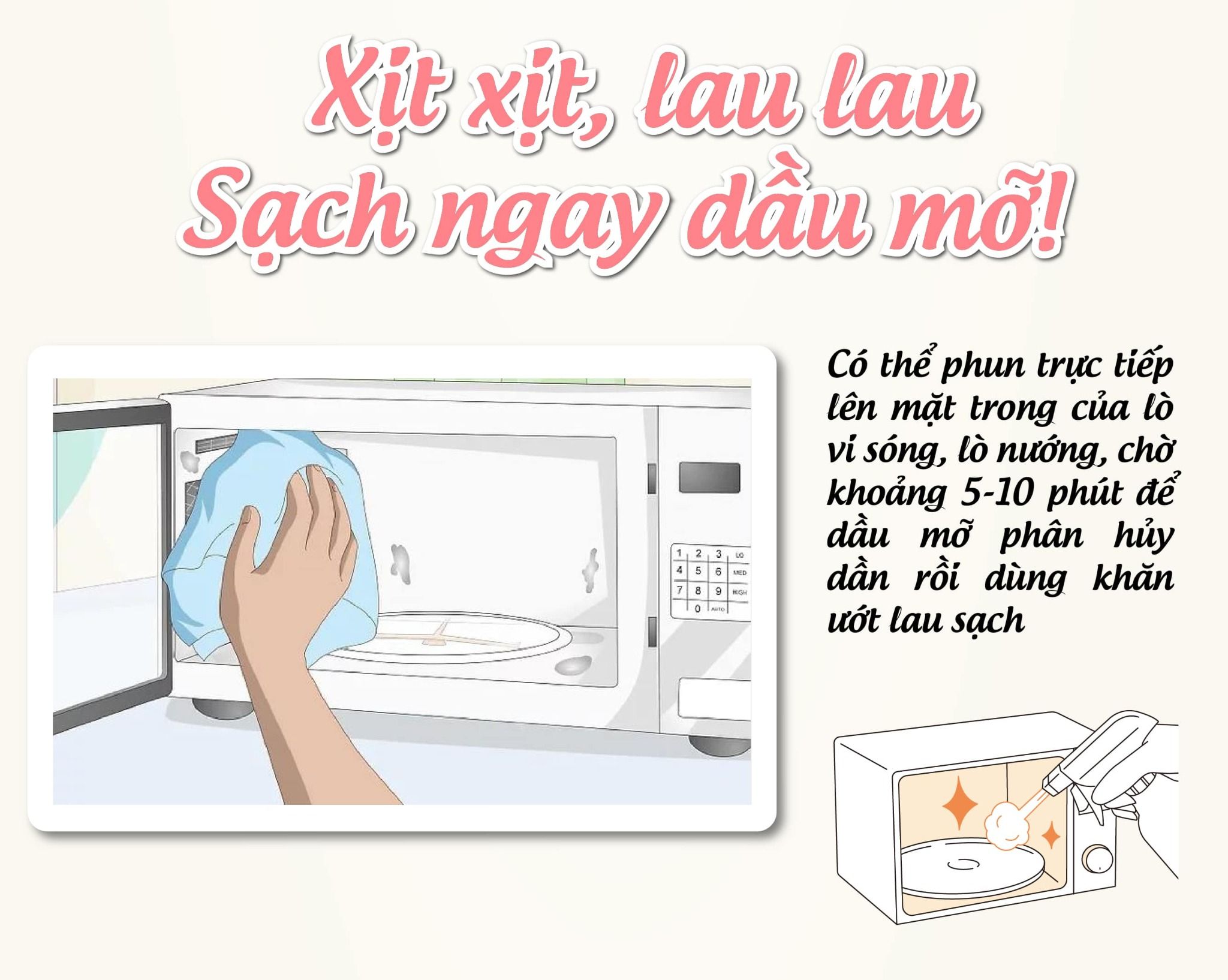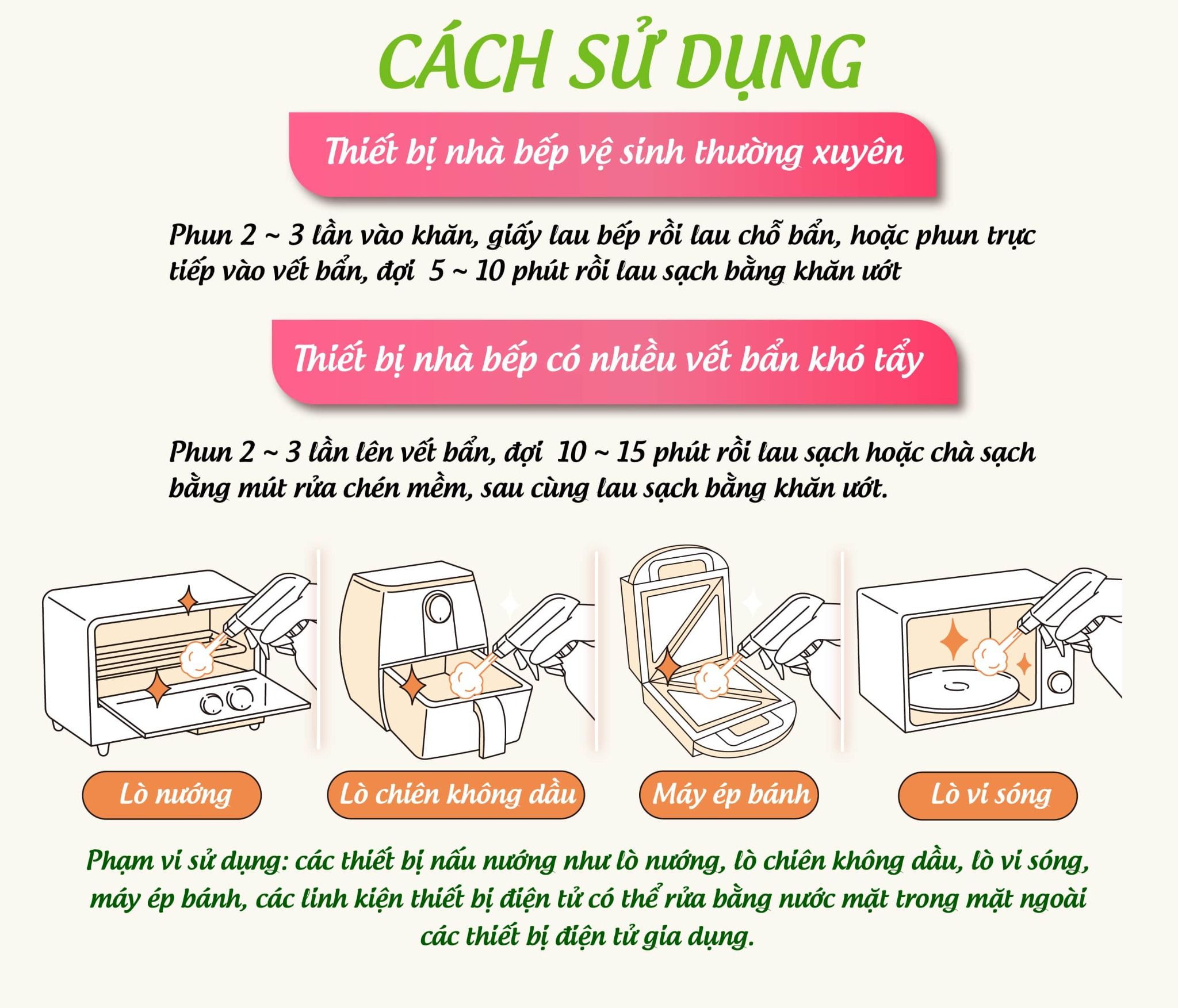 Phun 2 ~ 3 lần vào khăn, giấy lau bếp rồi lau chỗ bẩn, hoặc phun trực tiếp vào vết bẩn, đợi 5 ~ 10 phút rồi lau sạch bằng khăn ướt.