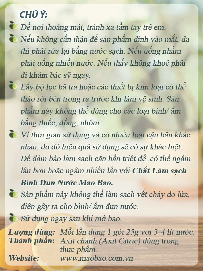 Chất làm sạch vệ sinh bình đun nước Mao Bao (25g x 2 gói) có thành phần Axit chanh (Axit citric) dung trong chế biến thực phẩm giúp làm sạch những vết bẩn, vết ố lâu ngày,…ngay trong bình đun siêu tốc/bình nước/ấm trà => Đảm bảo sức khỏe cho gia đình.