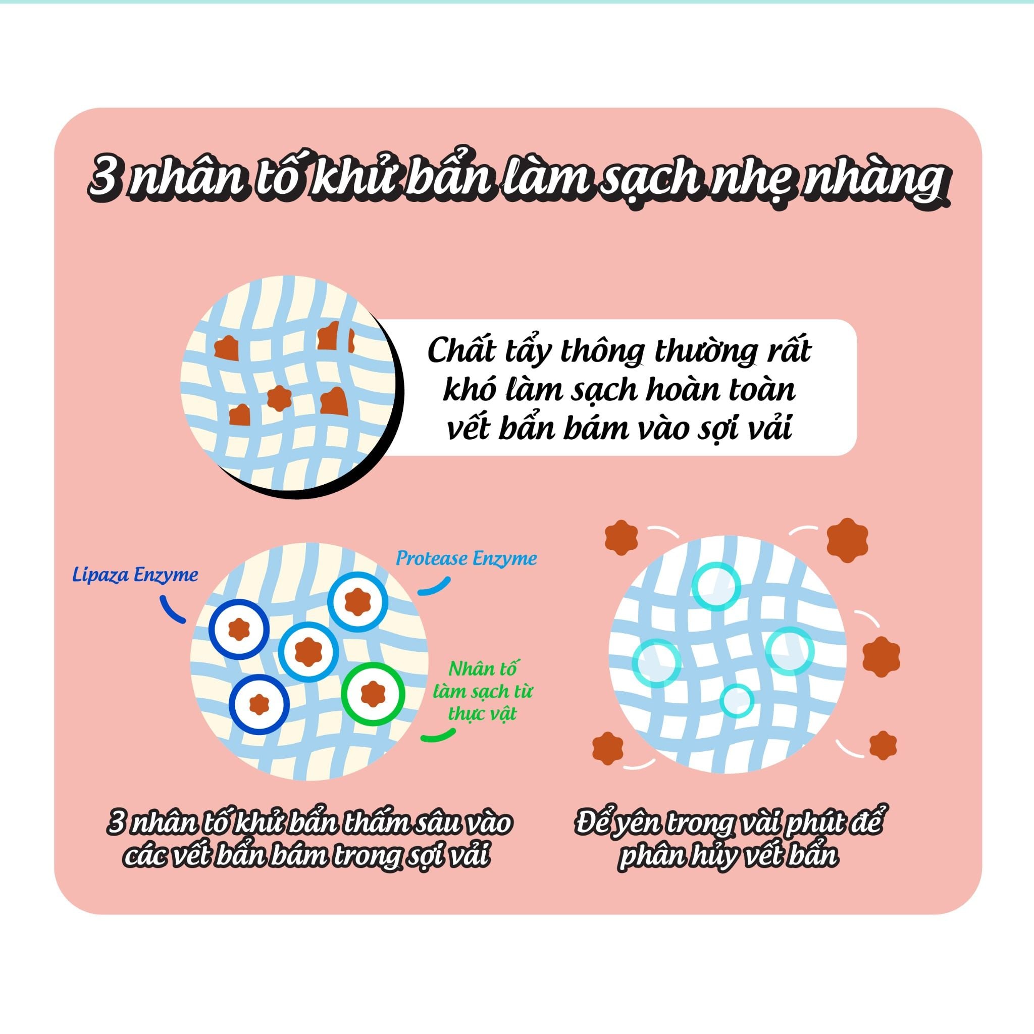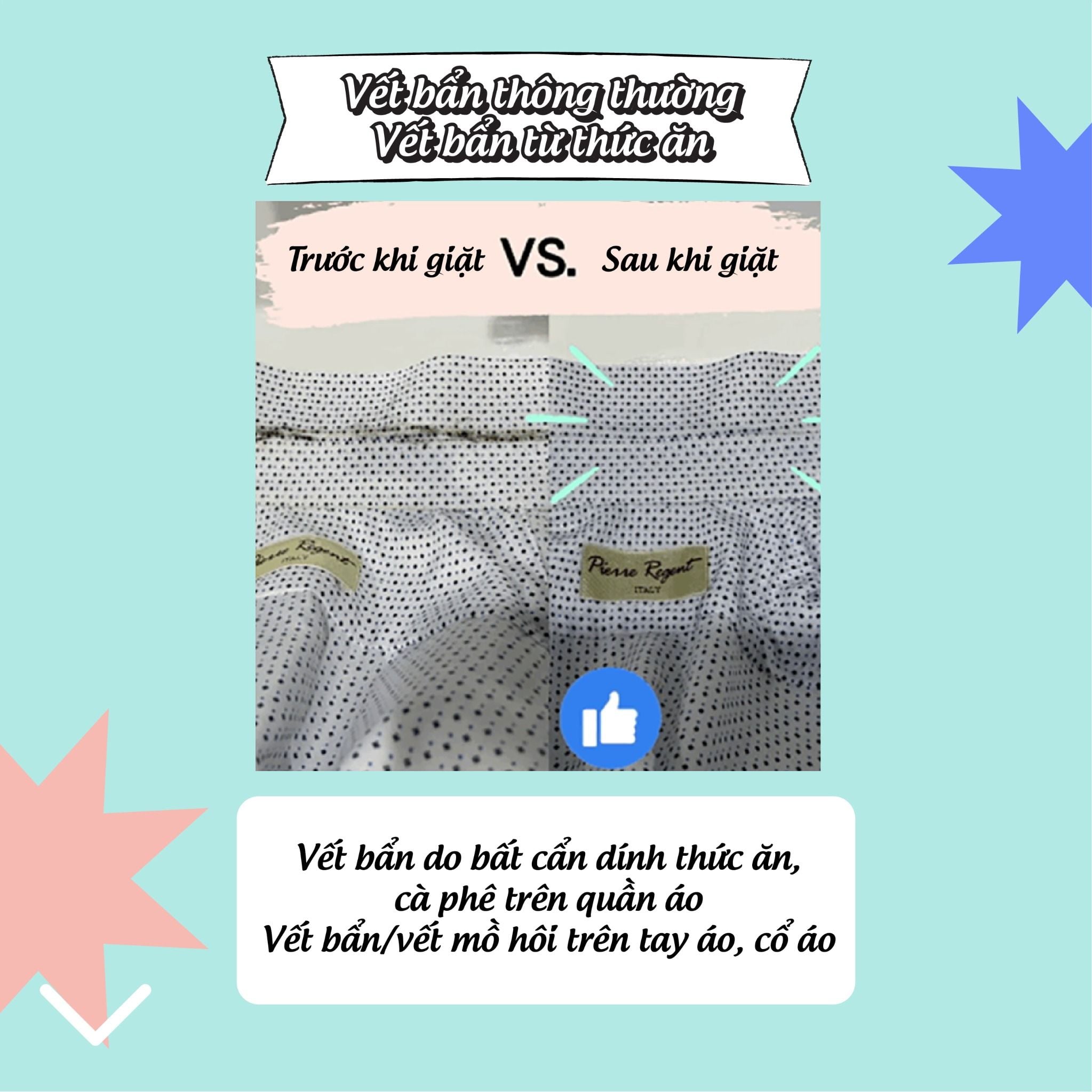 - Làm sạch các vết bẩn thông thường, vết mồ hôi: tẩy sạch các vết bẩn, vết mồ hôi, nước tiểu, vết máu