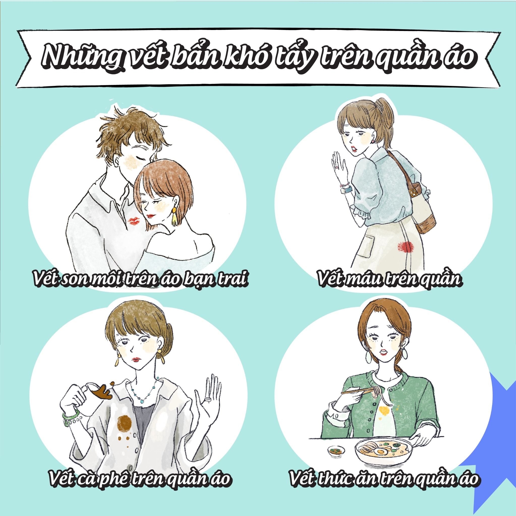 - Làm sạch các vết mỹ phẩm trên quần áo: tẩy sạch các vết mỹ phẩm trên quần áo như vết chì kẻ chân mày, son môi, phấn nền, kem chống nắng, ...