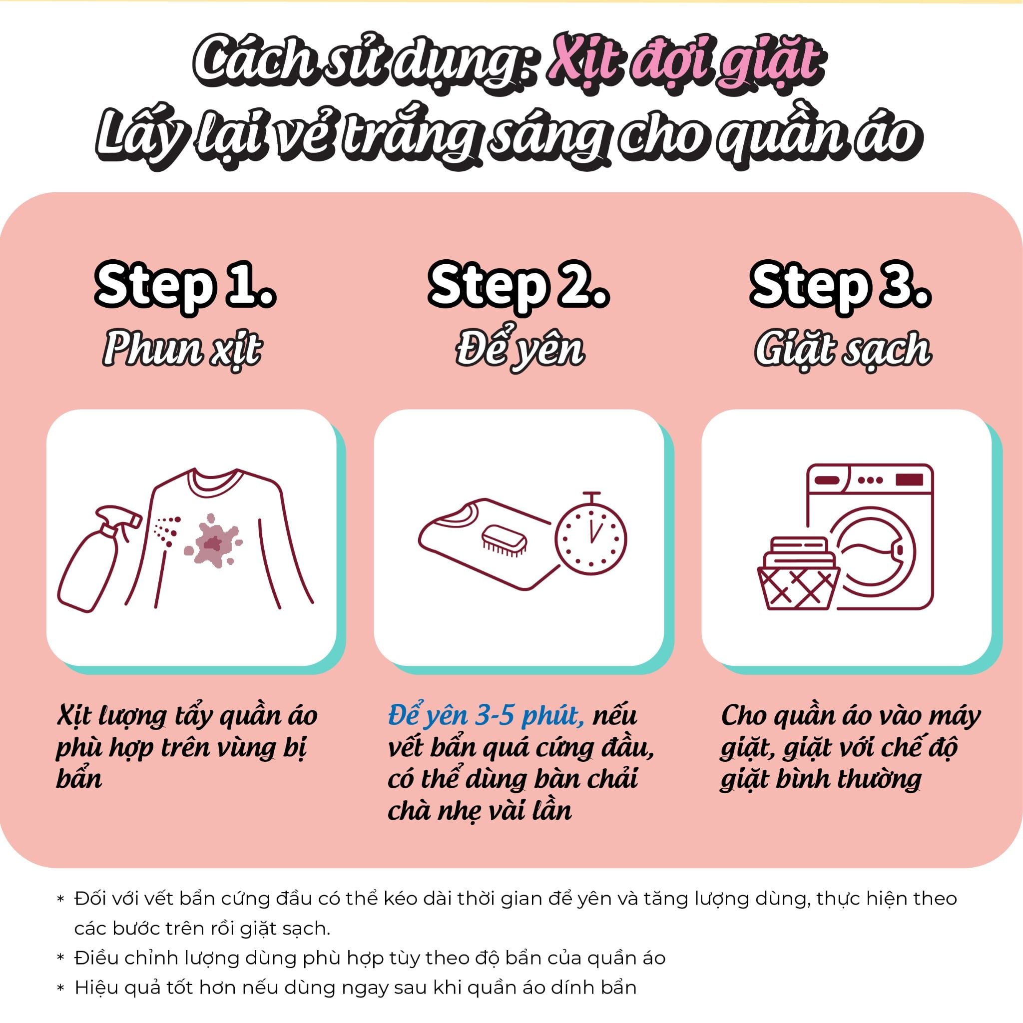- Không dùng cho quần áo có ký hiệu “Giặt khô” hoặc quần áo có chất lượng nhuộm màu không tốt, hoặc nên dùng thử trên một góc nhỏ trước khi sử dụng theo hướng dẫn trên.
