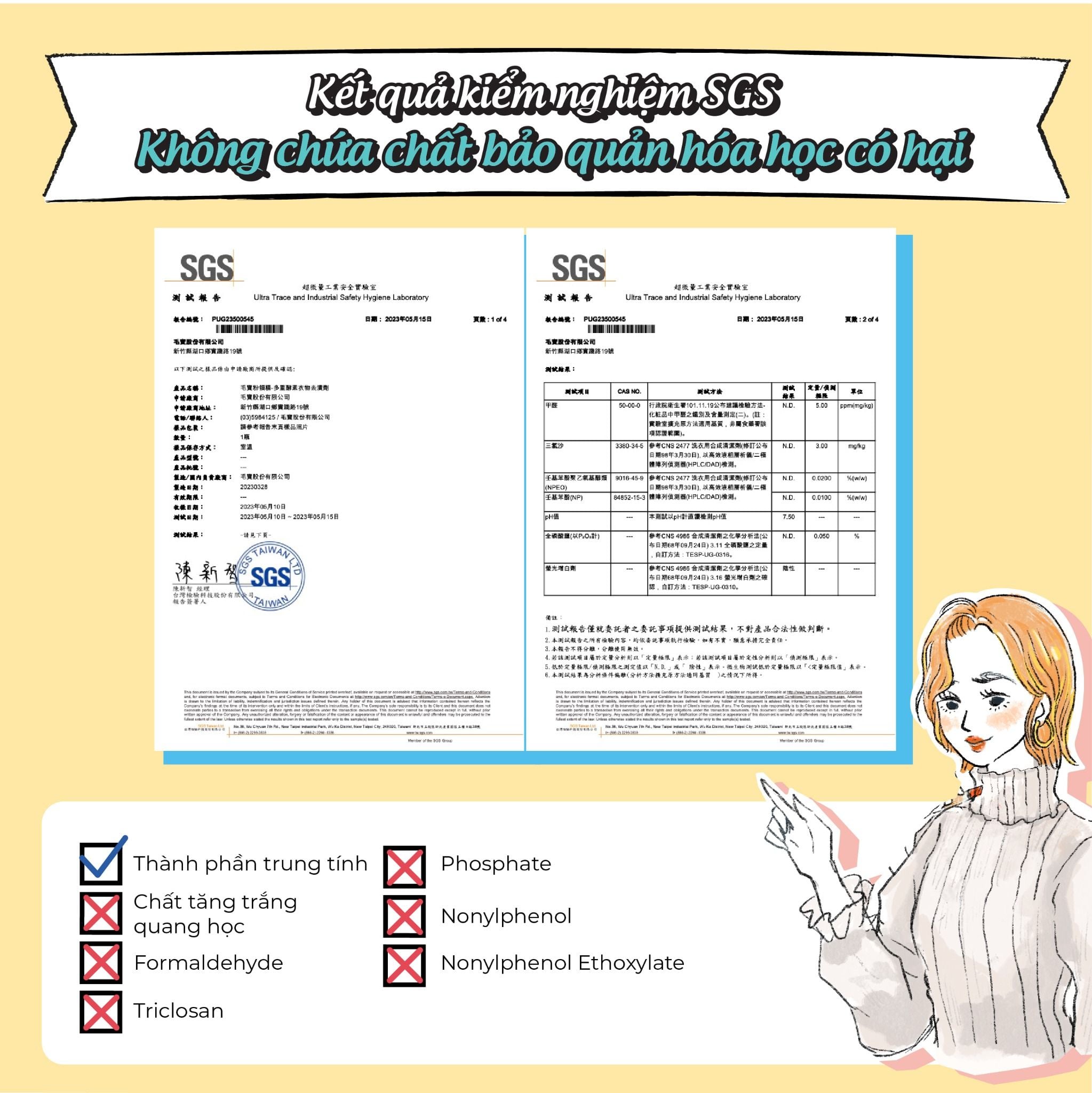 - Công thức trung tính, không chứa các chất gây hại như: chất tẩy trắng, chất tăng trắng quang học, phosphate, nonylphenol